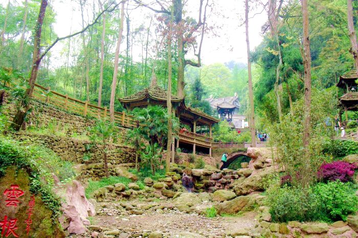 青城后山位于青城山后,深藏不露,山脚有泰安古镇和泰安寺。青城后山的宫殿香火虽不如前山旺盛,但清幽洁净更胜一筹,自然风光迷人。青城后山适合休闲徒步游,比起游人如织的前山,更能悠然的体会“青城天下幽”。进得后山山门,就是泰安古镇,镇上有多家客栈餐馆,还有古意浓郁的泰安寺。走过味江索桥,就来到后山的精华部分。往左可以走五龙沟,沿着山路可达又一村。又一村往上可达白云寺,这段路风光一般,可以乘坐索道直达,费用:单程上山35元,下山30元,往返60元。白云寺前行一小时可达翠映湖,湖畔风光不错,幽静雅致。