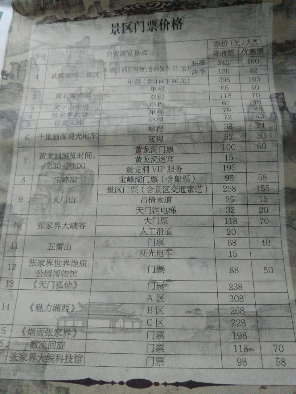 门票价格一目了然。我们选择的是淡季去,并且有学生票,天门山是每人135元加上3元保险。张家界是82元加上3元保险。张家界里还有一些缆车观光车需要收费,学生票都是淡季半价。所以趁着这时候去真的很省钱!张家界里面的所有环保车都是不收费的,免费无限次搭车的。