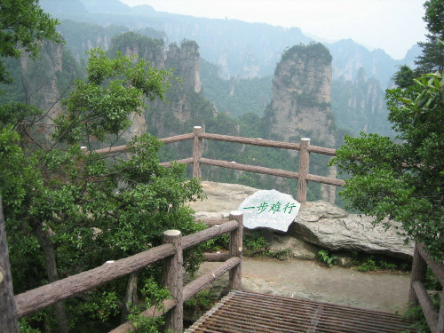怎么难行?两座山之间,是一米多的距离,下面是300多米的深渊,以前旅者都是靠跳过去的,91年到97年,每年都要掉下去一个人,第一个是北京大学航空航天学院的一个老教授,他的一步不够大,就摔下去了,同行的已经跳过去的几个上海人顿时吓呆了,躺山上不敢动弹只是不停大叫,直到救援人员搭好路让他们过去,我估计他们是以后都不敢再来张家界了。教授的尸体是采药山民下去用席子卷好拉上来的,教授的儿子把他葬在天子峰上,并写上“一步难行,一失足成千古恨”张家界的险啊!!97年是一个武警掉下去了,李伟说他是觉得这一步太小了,于是从远点的地方起跳,死因是过高估计自己的弹跳能力。从那以后,就再没人敢过去了,直到修好了这个铁桥。虽然有铁桥,但我们走过去的时候还是觉得脚下寒风阵阵,心里空空的。李伟的爸爸和叔叔是从80年代初开始做导游的,他听他的爸爸叔叔说,在有铁桥之前,每20个人,只有1个人敢跳过去。如果没有铁桥,偶还敢不敢过去呢??