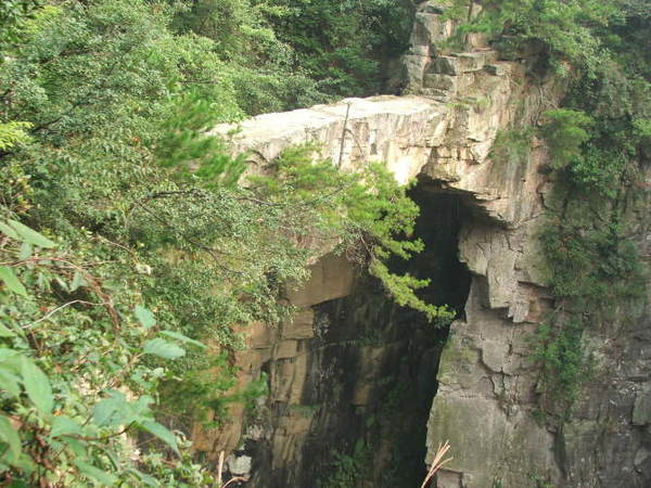 长40多米,宽才1米多的天然石桥,下面是350米深的山谷,没有任何保护设施,一脚差错就表想回广州了。这里本来就没什么人来游玩,但在通往仙人桥的路上,还是用铁丝醒目地打了个叉,为了告诉偶们“这里十分危险!”不过既然来了,不走一走对不起自己,鼓起勇气走了!!注意事项:千万表往下看,千万表试图用相机照下面,把它当成是最普通的路来走。所以我才觉得,第一天的“天下第一桥”不够意思,这里才是天下第一桥!!