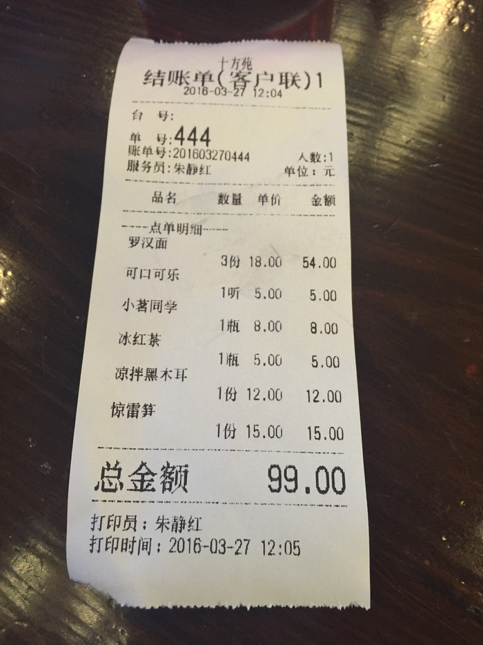 今天来的很巧,3月27日正好是农历二月十九,观音大士的诞辰,观音像前都是前来祝贺菩萨生辰的,虔诚祷告,供桌上摆满了供品,我们叩拜完众菩萨,便来到庙里的十方苑吃素面,整个大堂里挤满了吃素面的客人,三个人看这架势分头行动,我排队买面,她俩去找空位,点了三碗罗汉面,三种饮料,两盆冷菜,总共99元,还算实惠的哈,