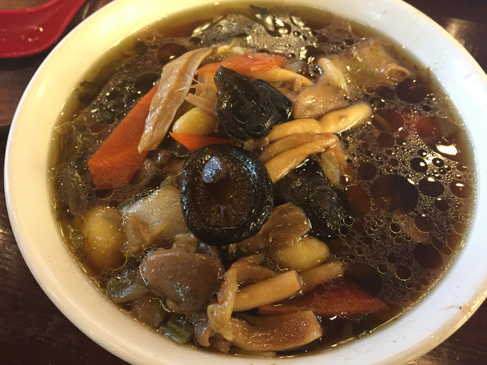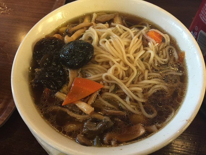 一看收银单,我们前面还有八、九十个客人在等候,坐下来一边喝饮料一边等,大概一刻钟时间,轮到我们了,看着面的卖相不错,都是爱吃的菌菇,很鲜美的味道,三口两口吃完,打算打道回府去杭州酒家吃晚餐,这个点已经是下午一点样子了。