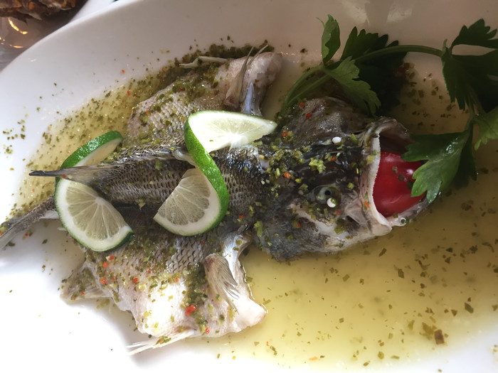 点了青柠檬鲈鱼、芭提雅烤鸡、冬阴功汤、马来贵妃苗、咖喱海鲜菠萝饭、芒果汁、香芒大虾沙律,