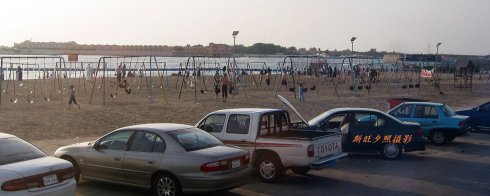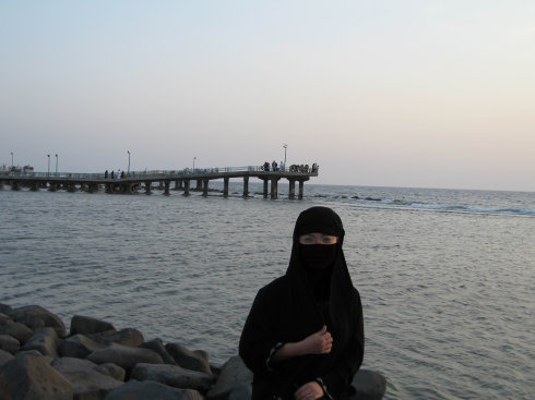在远离市区的一个海滩,我们发现有个海滨浴场,当然,这是红海边上的浴场。那帮哥们幸福的要去游泳。才发现,要下海的话,必须要穿那种长度及膝的泳裤。他们都下海了,俺留在车上,在车门和黑袍的掩护下照了这张照片。