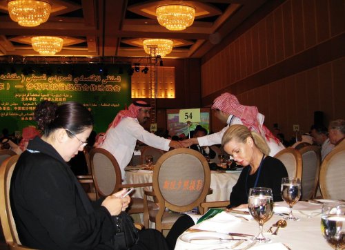 会场可以照相的一个后果就是:所有沙特方面的照相机、摄像机在会议前齐刷刷的都对着会场的后面。会议开始前,不时有人借谈生意的名义到后排来搭讪。结果在会议没多久,坐在后排的女士很多又坐回自己公司的桌子上去了。这情形就像现在国内讨论开设什么女士车厢一样,执行一段时间就走样了。