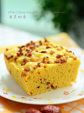 原料:蒸熟的南瓜 175g , 普通面粉300g , 奶粉25g, 牛奶96 g, 白糖40 g, 发酵粉4g,红枣粒50g