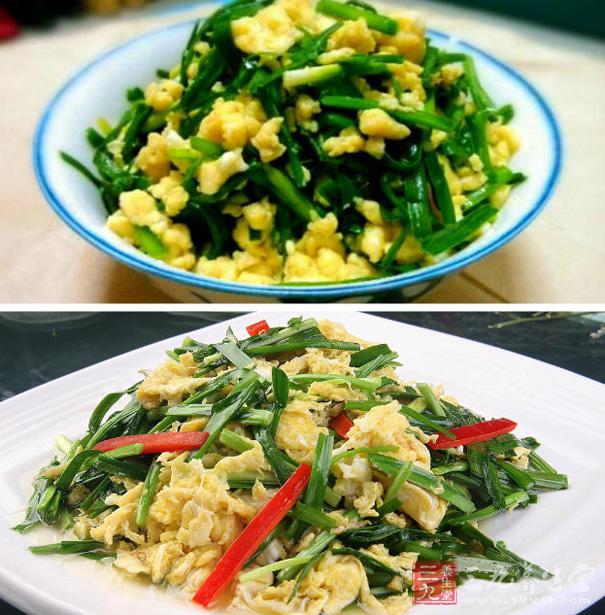 ③炒勺仿佛植物油烧热后,加入韭菜,用旺火速炒、放盐,快熟时倒入鸡蛋,颠翻两下,即可出锅装盘。