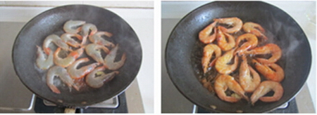 6.虾颜色变了后翻面去煎至金红色后盛出;