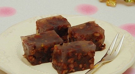 红豆糕是江南地区汉族特色点心。据说精致的江南点心系列,轻薄得如同几片红叶,可以从半透明的凝膏中清晰地看见暗藏其中的每一颗红豆馅料。
