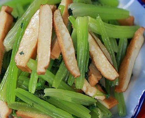 用料:豆腐干4块、香芹1把、食盐1/2茶匙、味精1/3茶匙、香油1茶匙、植物油适量、白糖1/2茶匙