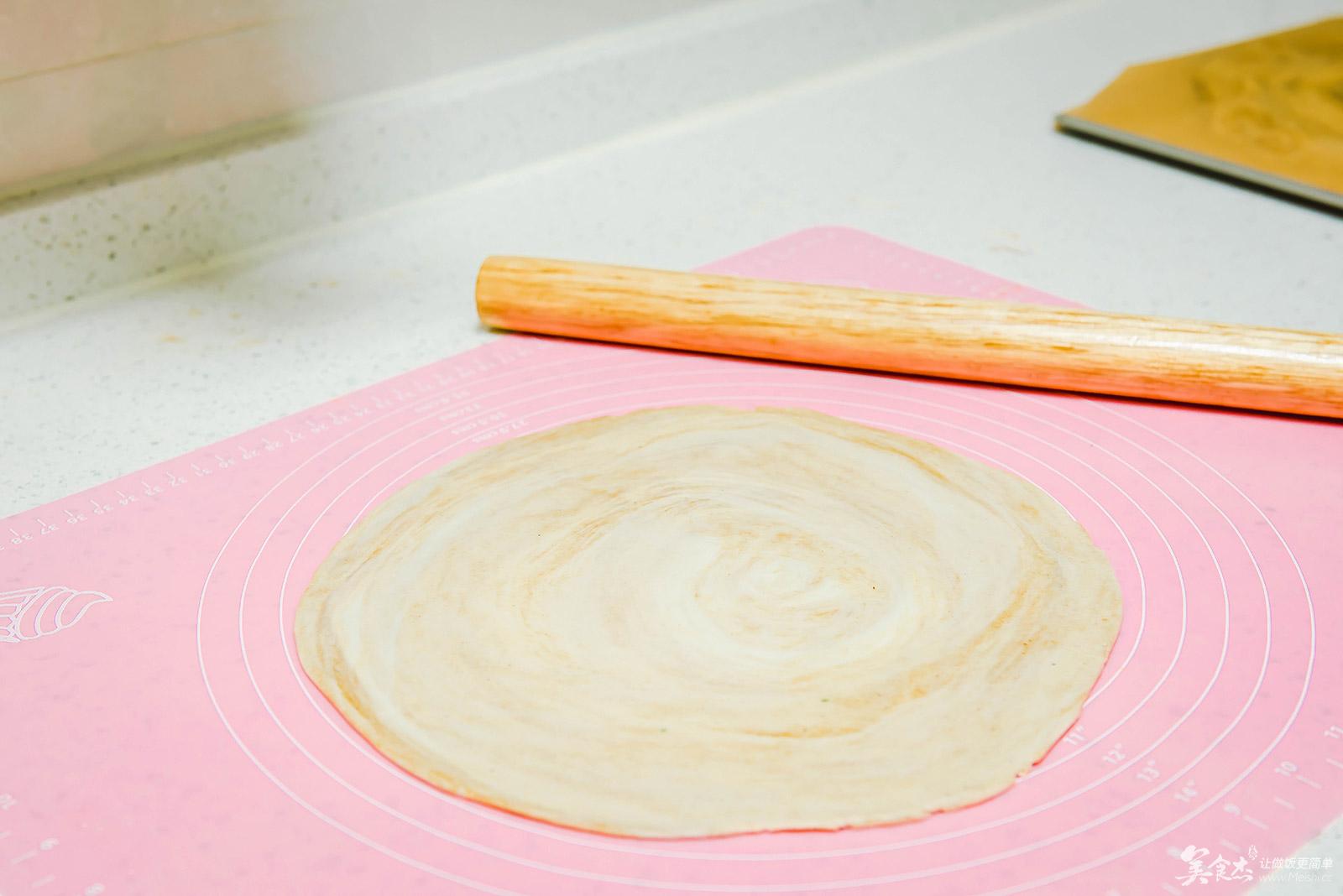 14.继续擀压成薄饼状,生面胚就做好了,我擀开的直径大约是22-24cm左右