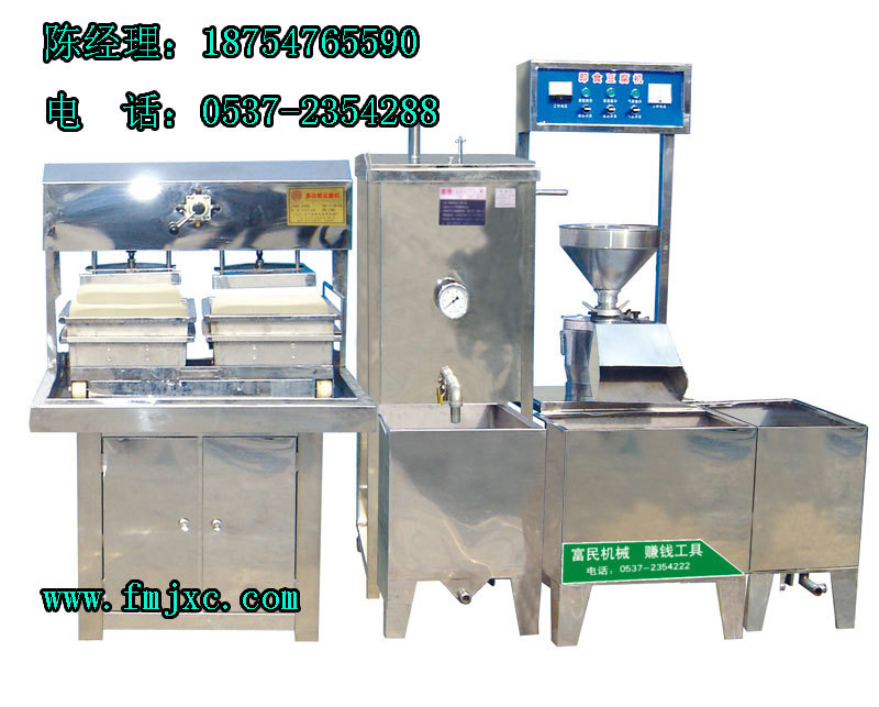 (全套生产线:含专用液化气、电加热两用不锈钢常压锅炉,含不锈钢成型设备4个,不锈钢料桶3个,含磨浆机,抽浆泵、加水泵,提供参考营销方案及大型广告彩图一套。另免费赠送豆浆封口机、内酯豆腐机、消泡剂1袋、内酯1袋、豆腐添加剂1袋、豆腐包布4块、砂轮1付、砂网2张、