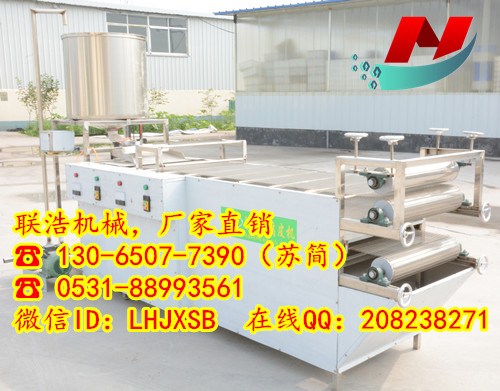 全自动豆腐皮机是由山东联浩机械厂经过多年深入研究出的一款新型实用全自动的豆制品设备。该设备体积小,生产速度快。是理想的豆制品加工设备。该厂秉着以科学技术为动力,以先进技术为理念;诚实、守信的经营方式,产品远销黑龙江、吉林、辽宁、云南、广西、四川、重庆、宁夏、河北、陕西等近30个省市!