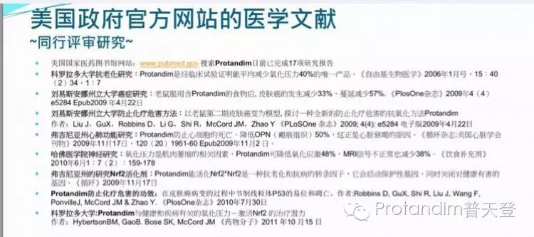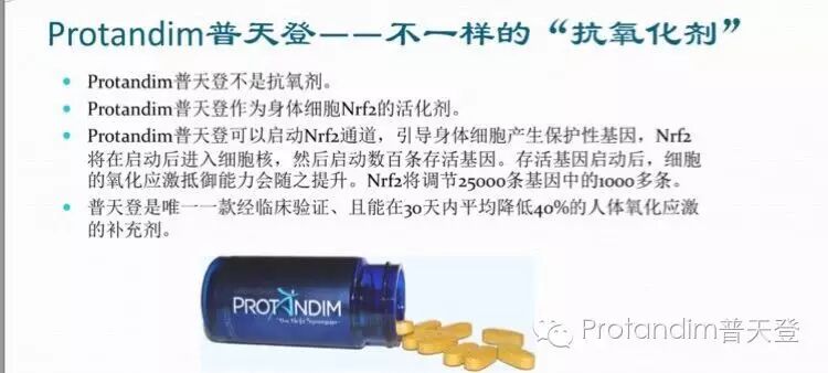 ——普天登(Protandim),不得不说的革命性产品。        这是美国LifeVantage公司(总部位于美国犹他州盐湖城,纳斯达克代码:LFVN)出品的一种基于活化人体自身抗氧化酶类表达的保健品。其主要组分包括奶蓟、假马齿苋、南非醉茄、绿茶、姜黄等纯植物提取物,因而瓶身上所标示的2个认证资质在保健品行列中很是抢眼:一个是美国禁药物组织(BSCG)对营养保健品无毒素的官方认证,另一个是美国国家卫生基金会(NSF)对产品的安全标准定期抽检认证。        这项产品的核心技术在于通过活化人体内的Nrf2(核转录因子),引导细胞产生更多携带基因编码的防御系统。换句话说,人体内本来就含有抵御氧化应激等压力环境的能力,但随着年龄的增长,这种抵御能力会逐渐关闭休眠。而普天登的研发就意在启动Nrf2这种蛋白质信使,激活部分基因,即所谓“存活基因”。这些被启动或激活的基因能让细胞在包括由自由基及其他氧化剂过剩而引起的氧化应激反应中存活。        简而言之,Protandim能够激发起人体自身的能力,来达到抗氧化的目的。而根据实验宣称:Protandim能在30天内平均降低40%的人体氧化应激。根据该公司网站公开宣称,其抗氧效力是其它口服外源性抗氧剂效力的100万倍!          同时,对Protandim的研究在美国多所大学医学部或医学研究中心展开,提供了关于Protandim多重功效的研究报告。其中有宣称,激活人体超强抗氧化酶的转录因子Nrf2可通过各种主要方式保护心血管系统并使其受益;并且将Nrf2与其他类型的保护性蛋白质关联起来,如增加脑源性神经营养因子、减缓大脑和神经细胞的炎性压力、改善大脑血管的完整性。按照这个产品的核心机理,Protandim对200多种与氧化应激反应相关联的人体疾病应有不同程度的帮助和改善。以我的理解,大致的意思就是:擒住了氧化应激反应这个致使人体衰弱生病的大凶,就有望从源头上改善身体环境,抵抗疾病和衰老的折磨。据称登录美国国立医药图书馆 输入“Protandim”就可以查询到临床医学报告。有生物医学背景并且英语较好的小伙伴,不妨去查证一下哈。 美国ABC电视台采访普天登产品技术主要贡献者Joe Mccord博士