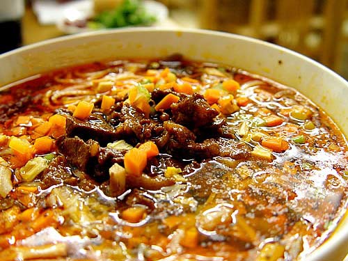 鲜艳的橙红色汤面上漂浮着四季豆、土豆、胡萝卜、肉丁、豆腐丁、西红柿等,红黄白黑青,花花绿绿,颜色上已是占得先机,这些配料也叫“臊子”。轻启朱唇,沿碗边慢慢吹出一片真空地带,在汤上嘬一小口,辣辣酸酸的味道拂过舌尖穿过喉咙直抵肠胃,爽口润心,畅快!