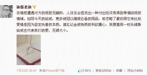 去年7月23日,涂磊在微博中发布了自己对爱情和钻戒的感言,并晒出了为爱情熊丹精心定制的乐维斯实名制钻戒,含蓄而理性的表达了对妻子的浓浓爱意。一时之间,又掀起了乐维斯定制狂潮,不少恋人们都以情感导师为榜样,渴望用乐维斯书写下自己与爱情的完美誓言。
