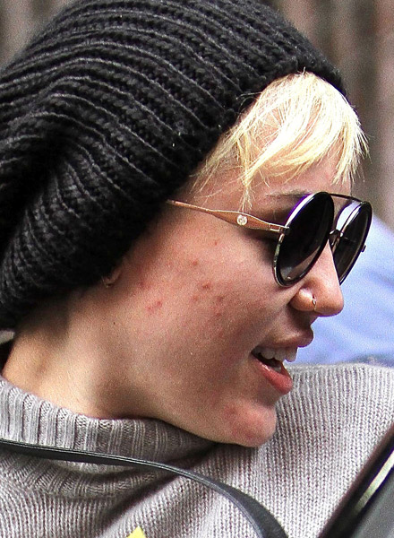 Miley Cyrus深受痘痘困扰,发红的痘疤从脸颊蔓延到下巴。