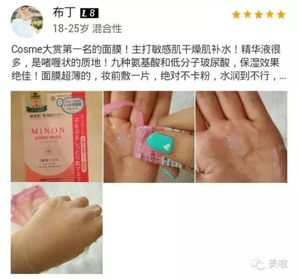 说到去日本必入的面膜,MINON这款保湿面膜当之无愧。它有着不输一线大牌的效果,保湿力极高,蕴含健康肌肤不可少的9种氨基酸,同样也含有神经酰胺成分。敷完面膜的脸,第二天会显得非常水润、有弹性。