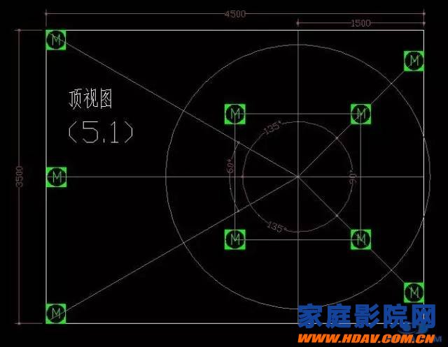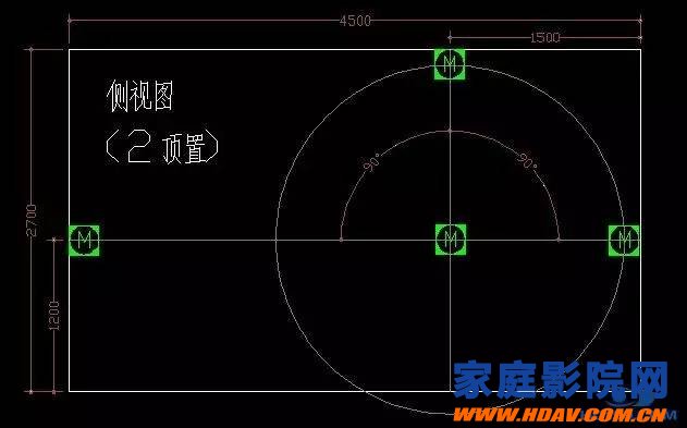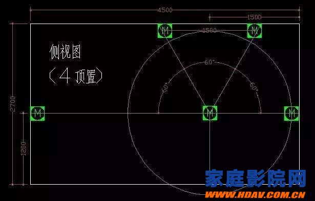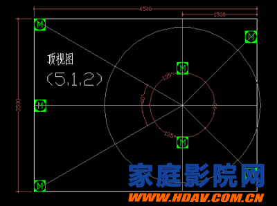 根据角度等分原侧,7.1.4的全景声布局如下:(假设的房间大小为:4.5米x3.5米,高2.7米)
