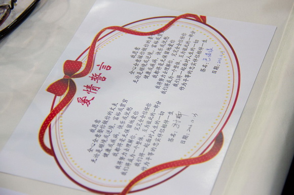 “不伪装自己迎合对方”——训练过程中,年轻的丈夫和妻子牵手搀扶,一起聆听宛如“心灵鸡汤”却也不乏可操作性的婚恋建议。“我将努力去理解你,完完全全信任你”——在印有爱情誓言的卡片上,新人们在共同认可的约定下郑重签下自己的名字。