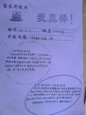 爸爸妈妈的心情和感受:从彤彤入园开始,就一直期待着开放日,很想看到宝贝在园里的各项表现,今天终于实现了,看到宝贝出色的表现,让我更加放心了,彤彤已经融入了这个大家庭中,适应了幼儿园的生活,开开始真正的喜欢学习生活,真正的相信自己,真正的敢于去面对,爸爸妈妈真心感觉到你长大了,继续加油吧!!