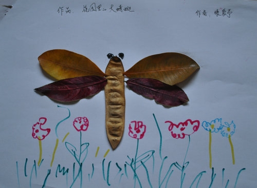 蜻蜓的身体是干透的榆荚,蜻蜓的翅膀,大幅的是略硬的“人心果”落叶,小幅的是某种灌木的落叶 -- 正面是绿色,背面是红色呢。