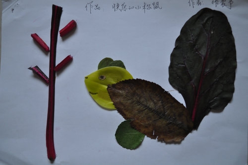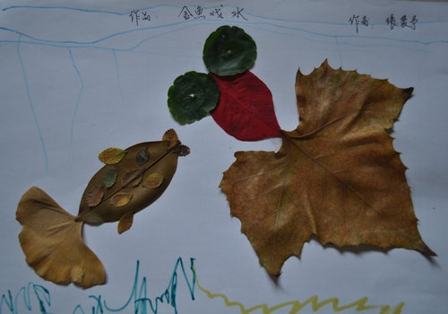 最终,我们以法国梧桐叶和银杏为主,粘贴出了一幅金鱼戏水图。图中,细细的鱼鳞、蓝蓝的池水、青青的水草均由红豆亲手操刀。