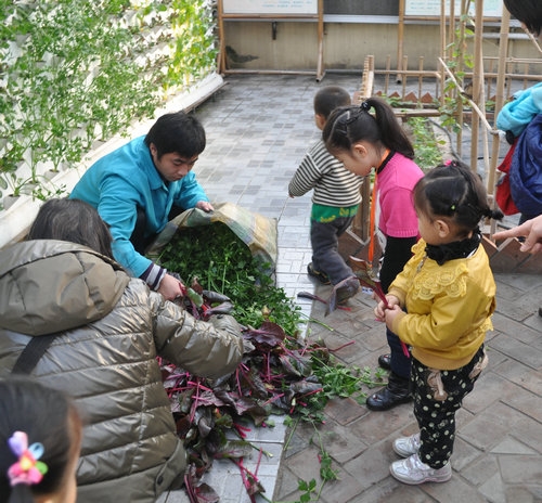 经过花卉大观园的农作物温室,恰逢工作人员把裁剪下的一些植物叶子堆在地上处理。红豆和小伙伴们立刻上手,收获自己的战利品。