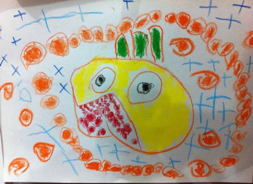 这天是星期四,每周孩子的图画课。红豆的图画正经不错。喏,这就是红豆的大作:“石榴妈妈”。