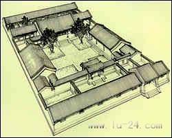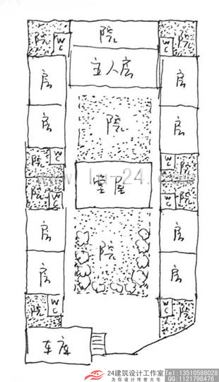 2.四周的住房全部朝中间的庭院开门开窗,虽然加强了家庭关系,但是隐私没有受到保护,不适合现今的家庭关系。我们可以将中间的庭院作为公用,但是每个房间又独自拥有一个相对封闭的小院,这样,大院套着小院,家庭的和谐和各自的隐私都得到了兼顾。空间还是原来的围合空间,但是院子分出了层次,我相信这是一个积极的改进,因为用于休息的房间并不需要直接面对公共的庭院,反倒是面对一个狭小的独立庭院更安静,更私密,更温馨,而且房间开向小院的窗户可以是落地的玻璃大窗,小院的绿化完全占满整个窗户,那该是一种何等的享受。 四合院式的家庭旅馆