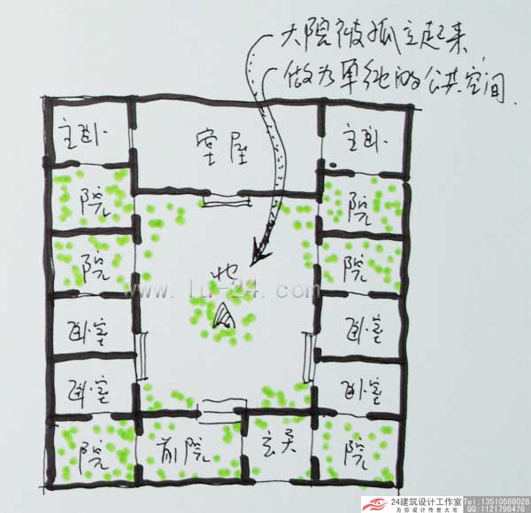 总之就是要把大院独立出来,作为单纯的公共空间,给每个房间一个独立的小院,保护隐私和大面积开窗。自然,有些卧室的开窗就会朝向北面,但是权衡之下,隐私的重要性应该大过开窗的朝向,尤其是在南方。