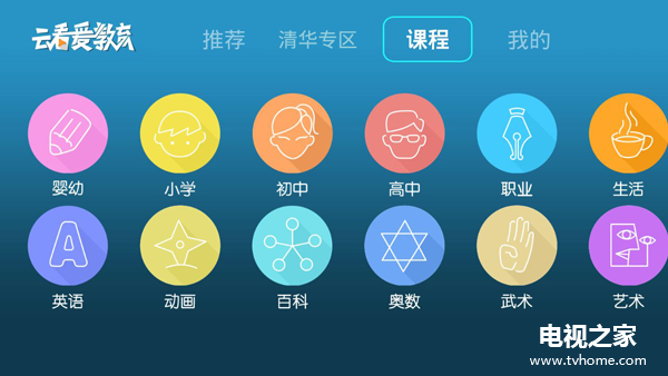 云看爱教育目标受众锁定全年龄段的家庭用户。早幼教以启蒙教育、习惯培养为主;中小学以K12同步辅导及高能提分的素质培养;成人类内容为职场充电及健身休闲生活;中老年以养生保健为主。家庭中的每个成员都能从云看爱教育中找到自己需求的内容,全家共同享受健康成长的空间!