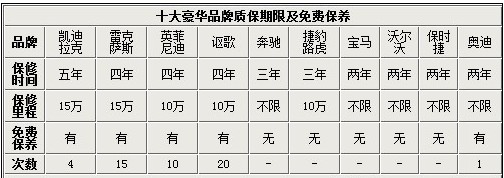 目前十大厂商均提供两年以上的保修期限政策,宝马、保时捷、奥迪、沃尔沃提供两年不限里程保修期限,奔驰和路虎怎是三年10万公里。凯迪拉克提供了五年或15万公里位列十大品牌常规动力车型保养期限之首,而雷克萨斯则提供了四年15万公里的保修期限,不过该品牌旗下混动车型则为6年或15万公里,电池则为10年或25万公里的保修期限。讴歌旗下车型在保修期限内,每行驶5000公里提供一次免费保养,雷克萨斯和英菲尼迪则均为车辆每行驶1万公里,赠送一次保养,最多分别为15次和10次,而凯迪拉克和奥迪分别赠送4次和1次保养。