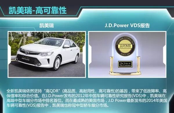 当然,广汽丰田有着这样的魄力也不是心血来潮,推出的免费保养政策的关键还是基于广汽丰田全新凯美瑞的优异的产品品质。全新凯美瑞依然坚持“高QDR”(高品质、高耐用性、高可靠性)的基因,带来了低故障率、高保值率和综合价值。在J.D.Power发布的2012年中国车辆可靠性研究报告(VDS)中,凯美瑞在高端中型车细分市场中排名首位。而在最成熟的美国市场,J.D Power最新发布的2014年美国车辆可靠性(VDS)报告中,凯美瑞也称冠中型轿车细分市场。