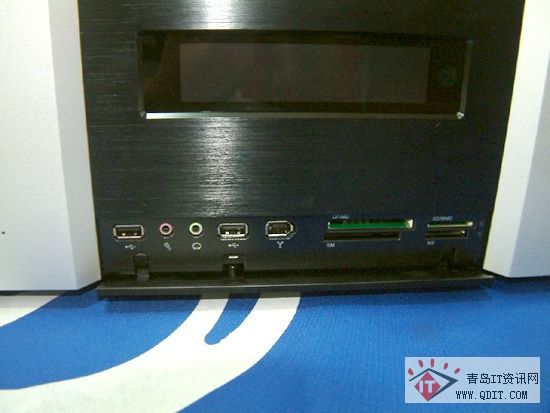 机箱前面板。机箱两侧为全铝的材料,中间部分是黑色的,除了上部的光驱,中间的VFD屏之外,下面的前置接口对于HTPC机箱也是不容忽视的。两个USB,音频和读卡器等接口还算全面,不过如果增加了USB3.0或者是eSATA接口,那就更好了。