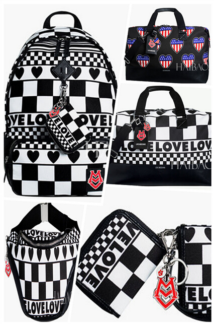 Jeremy Scott延续了Love Moschino复古风格,在2015春夏包袋系列的设计上先是把黑白配与爱心玩出了不少花样。除了黑白格子的包袋外,还将美国国旗图案的爱心也加入其中,展现了幽默童趣的设计师风格。