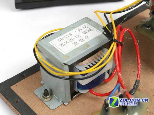 掉螺钉,打开音箱的低音炮,我们发现其板材非常厚实,变压器、电路部分、功放散热片被安置在背板上面。