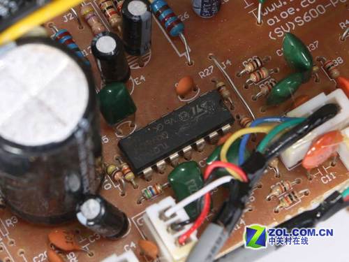 索威S1000的使用了四颗TDA 2030A芯片,这是一种常见的功放电路。功放芯片的发热量不算太大,不过由于箱体背板为木质结构,所以在内部放置了一个铝质散热片,四颗芯片被固定在散热片上,并涂有散热硅脂,以加强导热。