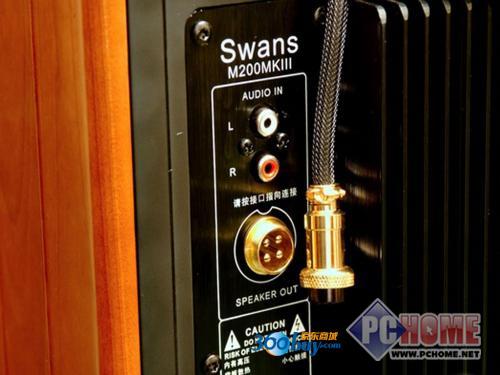 箱体背部同样为棕色木纹帖皮设计,带有音量和高低音调节金属旋钮,输入线插孔采用镀金材质,并采用专业线材,倒相孔位于后部,总输出功率为110W,从细节处也看出设计者的严谨态度。