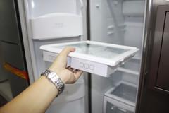 西门子冰箱门出现的不水平问题,在这款LG对开门冰箱上也没有发现,这款冰箱的容积没有上一款西门子冰箱的容积大,但是我们通过上图也可以看到这款冰箱的冷藏室储物格和制冰盒、储物箱的距离较远,储物箱抽出的空间也十分充足,冰箱门只要开启90度左右就完全可以方便使用,就算冰箱两侧的空间比较小,也没问题。