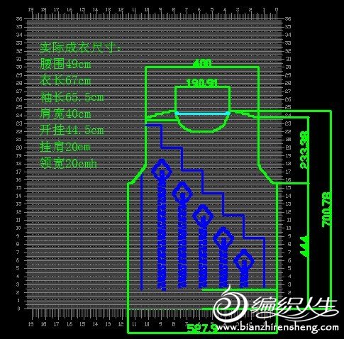 本帖最后由 snowli86 于 2012-12-27 19:57 编辑 这是我织的第三件成人毛衣,小孩的织过3件,我算新手么? 其实图解没什么好显摆的,兰心那里有。我说说我的制图方法,用的是cad(一种机械制图软件,我学工科的,我用这个来画毛衣了,:titter)。我先按小样,画出行列的小格,然后按需要的尺寸来画毛衣外形,再填花样。袖山和挂肩那里的话,直接量袖山的长度,等于挂肩的长度,缝合的时候肯定就能对上啦,不等的话,调整袖宽呀什么的尺寸,直到相等位置。忽然发现自己的表达能力不灵,不知道大家能不能明白。真人是我妈,那是没洗前的图,洗后我妈不给我拍了,说脱掉外套冷。洗过后,宽度变宽,长度变长。 第一次发帖,也不知道发的对不对。先发的试试 [查看全文]