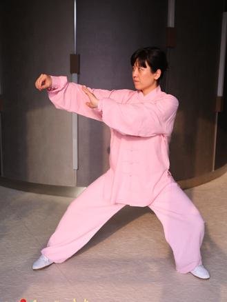 要求:移重心时,裆走外下弧线,旋转移动,左膝不能超出左脚尖;左手外翻时,不能挑肩架肘。此动吸气。