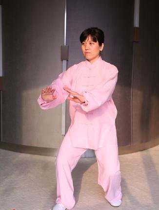 要求:左手与右手相合时,与身体右转、重心右移相结合,两手坐腕接劲。此动吸气。