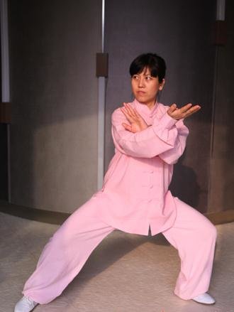 要求:左脚尖外摆,右脚尖内扣,松胯屈膝,立身中正,虚领顶劲,松肩沉肘,两臂与两腿有上下相合之意。此动为外或内合,呼气。