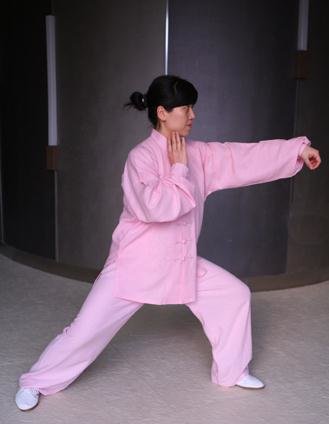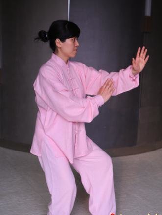 要求:步法稳重,上步轻灵自然。此动先呼气后吸气。