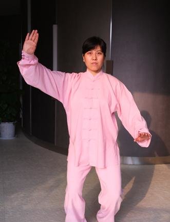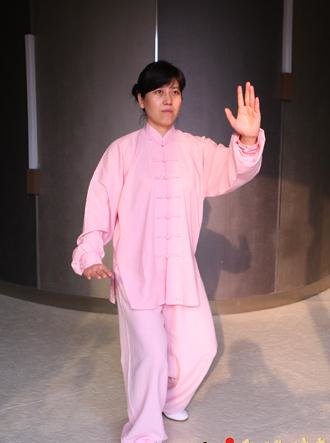 要求:重心走下弧后移至右腿,左腿收回要自然。此动吸气。