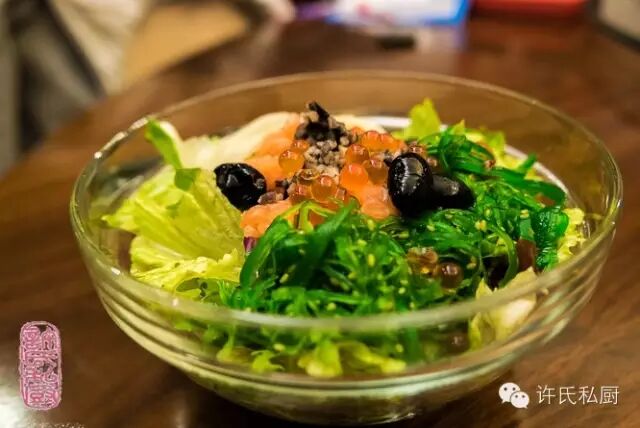 蔬菜沙拉:这是一道简单的沙拉,配了点三文鱼鱼子和一点海带。沙拉酱的话,如果是减脂餐,尽量用醋类的沙拉酱(避免选用高热量的芝麻酱或者千岛酱)。