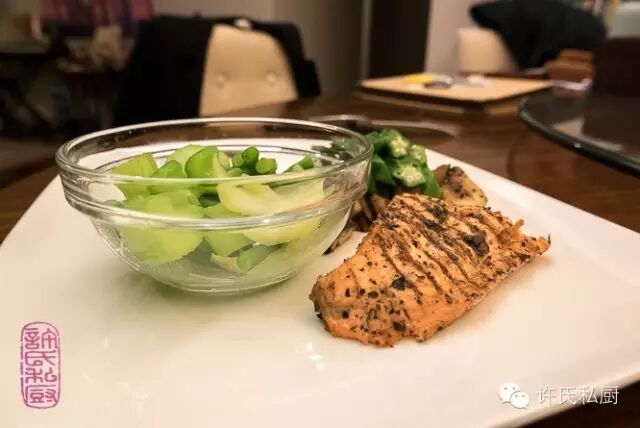 烤三文鱼配蔬菜:在“口袋减脂营”的食材单里,允许吃三文鱼或其它鱼类,这是刚开始时简单的烤三文鱼,配上些蔬菜和秋葵;晚餐基本上就是定量的肉、蔬菜和少量的碳水化合物(如米饭、红薯、玉米等)以及一定量的菌类;午餐会加一定量的豆腐。