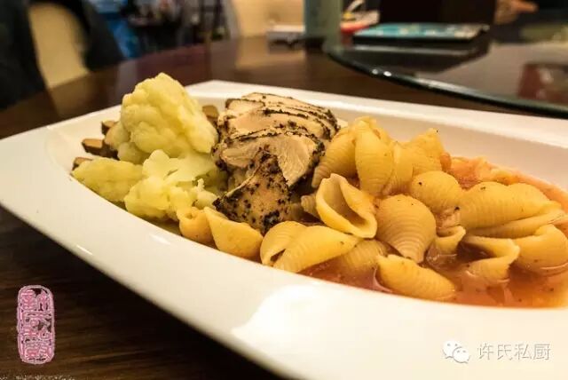 意大利面:中午一餐可以有适量的碳水化合物。我用我做意大利肉酱的方法,改变一下做出汤汁。这是一道番茄酱贝壳意大利面,配鸡胸肉和菜花。(文末有意面酱做法)
