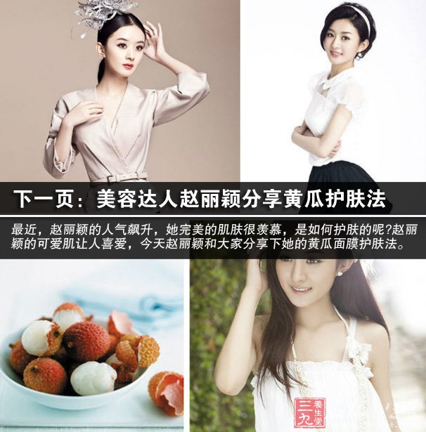 赵丽颖和大家分享她的护肤方法,她平常就是特别爱吃水果,像荔枝啊,含有丰富的果胶成分、维生素C以及铁,这些都是肌肤所需要的成分,不但可以使肌肤光滑,还能够改善肤色的健康。她还特别喜欢吃番茄汤,赵丽颖告诉大家,可以多喝点番茄汤,番茄内含有丰富的维生素以及一些矿物质,不仅能够帮助肌肤吸收大量的维生素C,还能够起到抗氧化的作用,延缓肌肤的衰老。